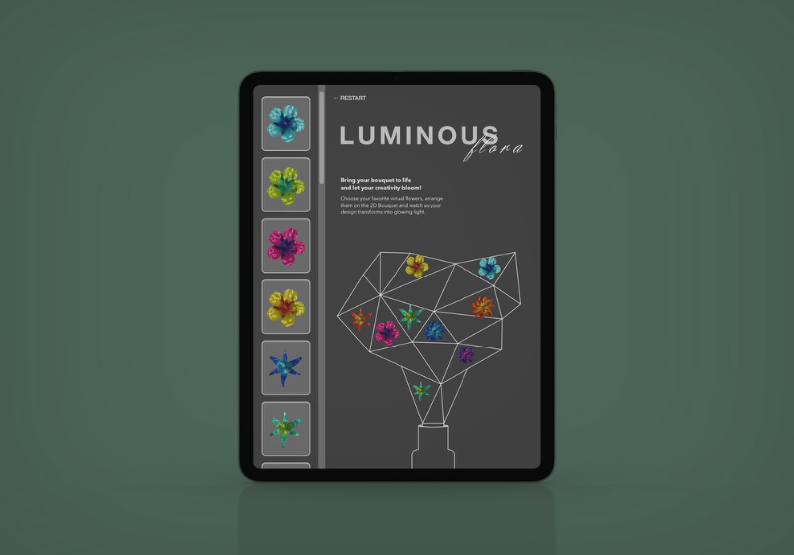 This project invites visitors to create their own personalized flower arrangement, combining creativity and technology for an immersive, interactive art experience. Using a tablet, visitors can design their bouquet by choosing which flowers they want and arranging them in any way they like. The flowers were meticulously developed in a 3D program to ensure they feel life-like, capturing realistic textures, colors, and shapes. These virtual flowers are then projected onto a custom-made polygon structure, giving the arrangement a tangible, three-dimensional quality. The project highlights the fusion of art and technology, encouraging creativity while showcasing the potential of digital design in creating a unique, interactive installation.